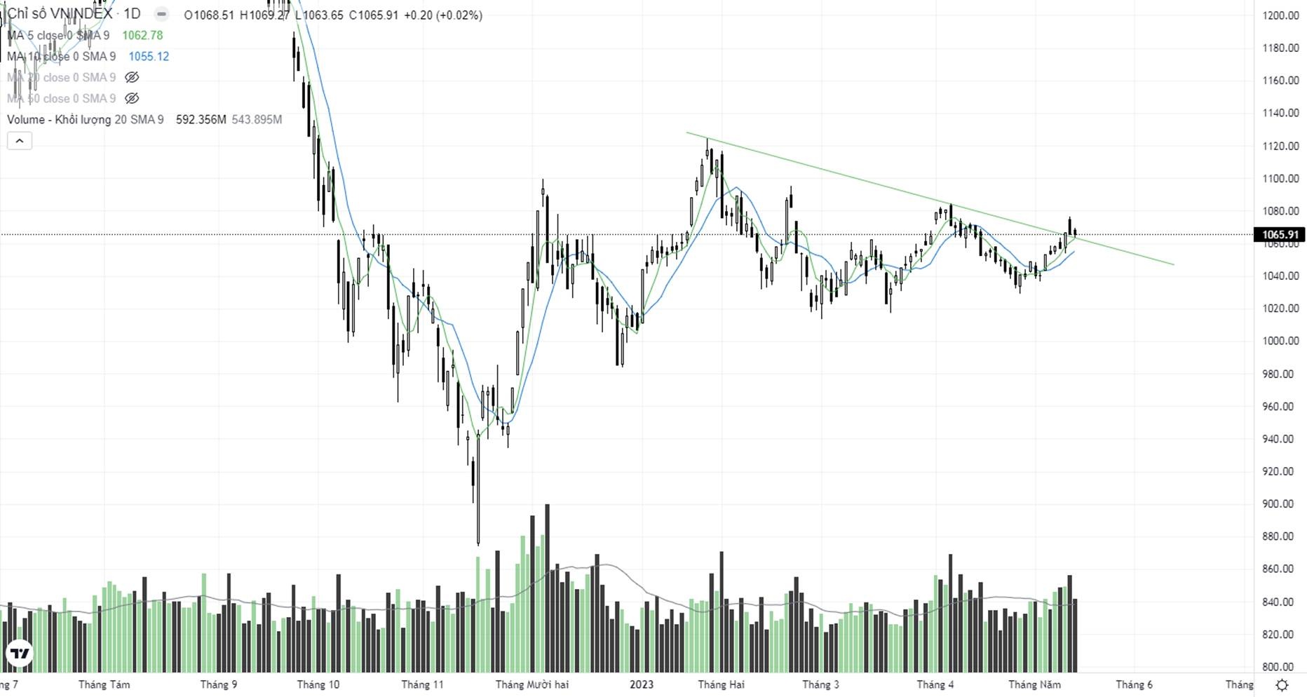 Về kỹ thuật, các ý kiến này cho biết VN-Index giảm nhẹ trong phiên để test lại hỗ trợ của cản chéo mô hình đi ngang và đóng cửa với sắc xanh là tín hiệu tích cực. Điểm số được dự báo sẽ hồi phục lại vùng 1.070 điểm trong phiên tới và thậm chí có thể tăng mạnh hơn tới vùng 1.080 điểm.