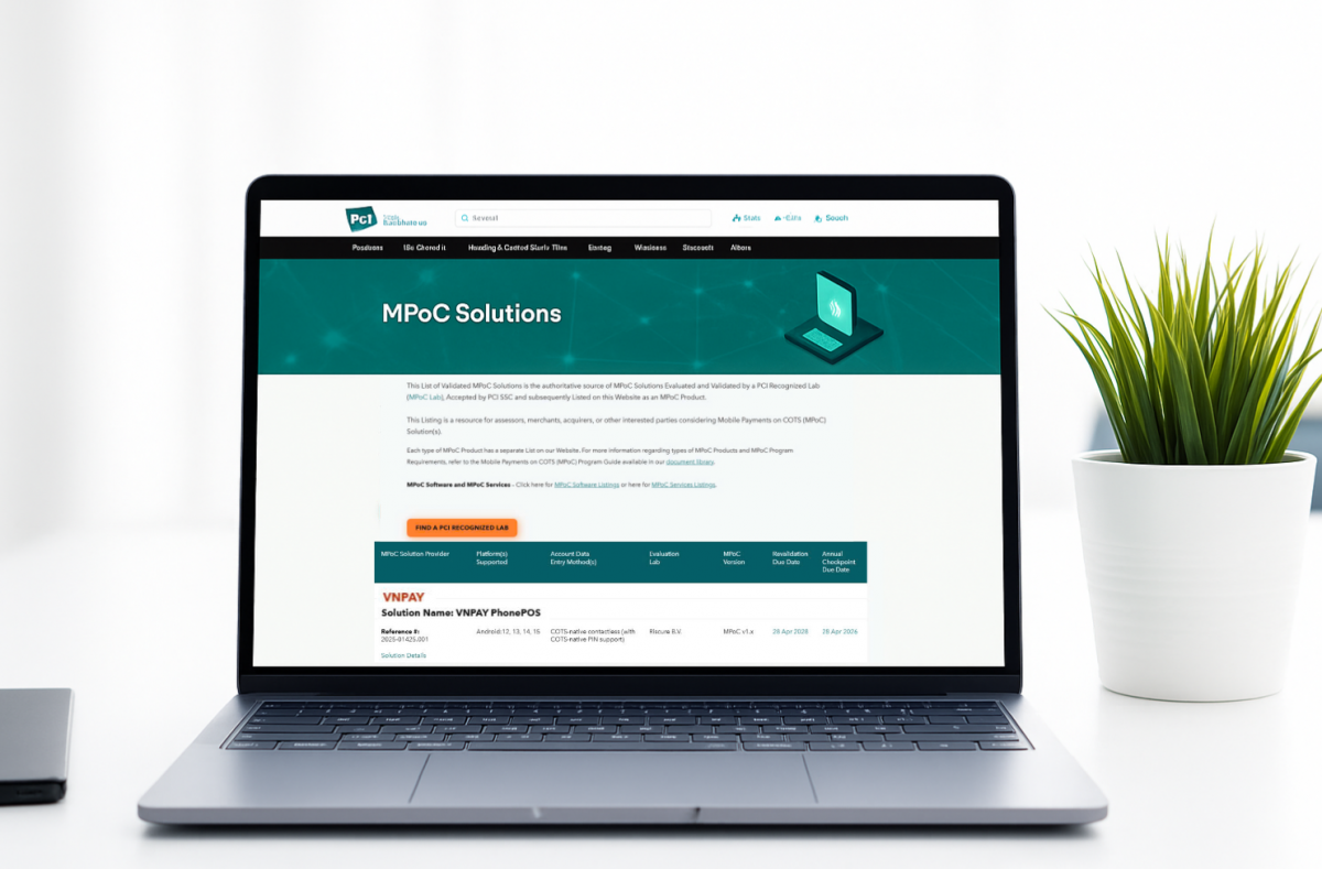 Theo công bố chính thức từ Hội đồng Tiêu chuẩn Bảo mật Ngành Thẻ Thanh Toán (PCI SSC), VNPAY là đại diện đầu tiên đến từ Việt Nam đạt chứng chỉ MPoC, với giải pháp thanh toán di động VNPAY PhonePOS.
