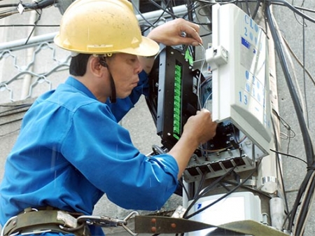 Nhân viên VNPT sửa chữa cáp viễn thông Ảnh: TẤN THẠNH