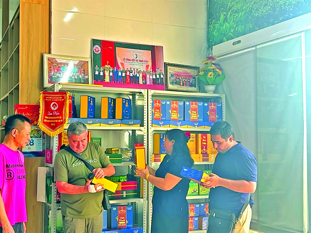 | Đoàn khách từ Nga xem mẫu sản phẩm tại Công ty TNHH chè Hoài Trung |