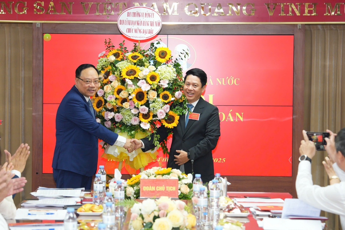 | Thay mặt Ban Thường vụ Đảng ủy, Ban Lãnh đạo NHNN, Phó Thống đốc Phạm Tiến Dũng tặng hoa chúc mừng Đại hội |