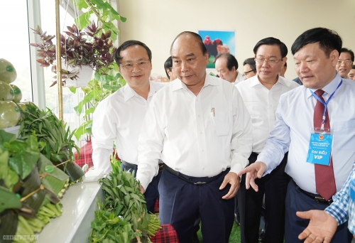 Thủ tướng và các đại biểu thăm gian trưng bày sản phẩm nông nghiệp của khu vực Bắc bộ. Ảnh: VGP/Quang Hiếu