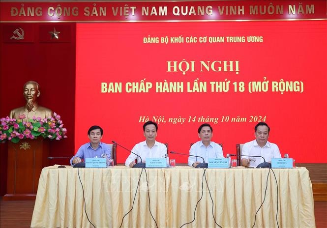 | Các đồng chí Thường trực Đảng ủy Khối chủ trì Hội nghị Hội nghị Ban Chấp hành Đảng bộ Khối lần thứ 18 (mở rộng). Ảnh: TTXVN |