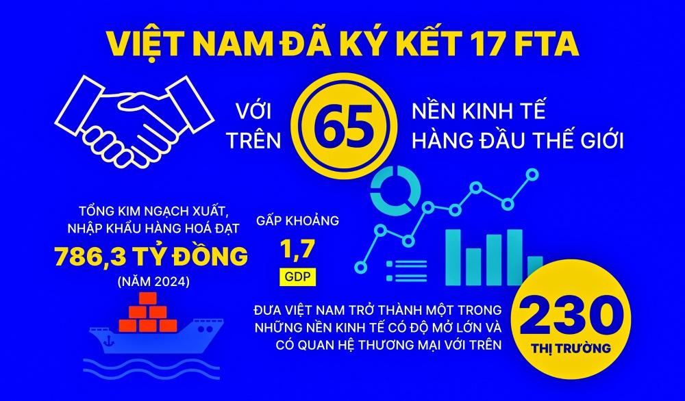 Thứ hai là mức độ hội nhập kinh tế cao. Việt Nam đã ký kết 17 FTA với trên 65 nền kinh tế hàng đầu thế giới; tổng kim ngạch xuất, nhập khẩu hàng hoá đạt 786,3 tỷ đồng (năm 2024), gấp khoảng 1,7 lần GDP, đưa Việt Nam trở thành một trong những nền kinh tế có độ mở lớn và có quan hệ thương mại với trên 230 thị trường. Thị trường tài chính đang trên đà phát triển. Hệ thống ngân hàng ngày càng tiệm cận chuẩn Basel. Thị trường chứng khoán đạt mức vốn hóa tương đương hơn 70% GDP, các rào cản với nhà đầu tư nước ngoài đang được dỡ bỏ. TP. Hồ Chí Minh hiện là trung tâm tài chính lớn nhất cả nước, đóng góp 15,5% GDP, hơn 25% tổng thu ngân sách, và gần 11,3% kim ngạch xuất khẩu. Thành phố cũng đã được xếp hạng trong Chỉ số Trung tâm Tài chính Toàn cầu (GFCI) và có xu hướng cải thiện thứ hạng qua các năm.