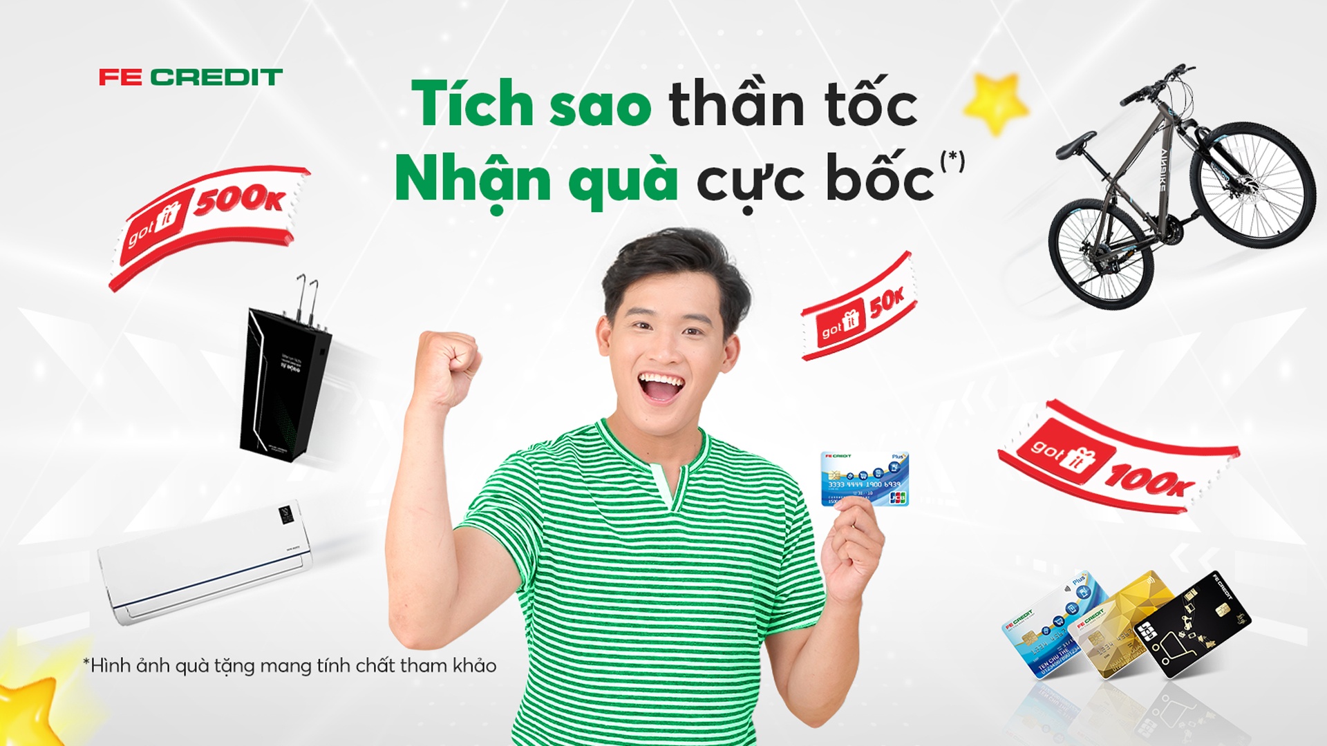 Đồng thời, từ nay đến hết 30/6/2023, với mỗi giao dịch thanh toán, chi tiêu, mua sắm thành công trên thẻ tín dụng FE Credit, chủ thẻ sẽ nhận được số Sao tương ứng với tổng số tiền đã chi tiêu (10.000 đồng sẽ quy đổi được 1 Sao). Số Sao tích lũy để quy đổi thành nhiều phần quà hấp dẫn như Máy lạnh, máy lọc nước, xe đạp, voucher mua sắm Got It…