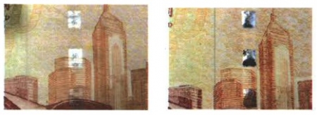Các chi tiết in Intaglio: Các họa tiết không được sử dụng phương pháp in Intaglio nên không có độ nhám ráp như ở tiền thật.