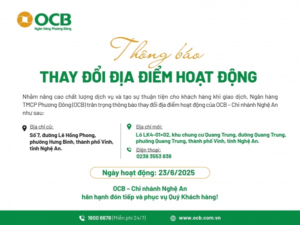 OCB thông báo thay đổi tên và địa điểm hoạt động Phòng Giao dịch Hoàng Văn Thụ (TP.HCM)